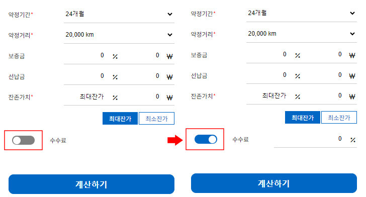 6. '금융조건'은 약정기간, 약정거리, 보증금, 선납금, 잔존가치를 설정 후 수수료를 입려하고 계산하기를 눌러 월납입금을 산출합니다.